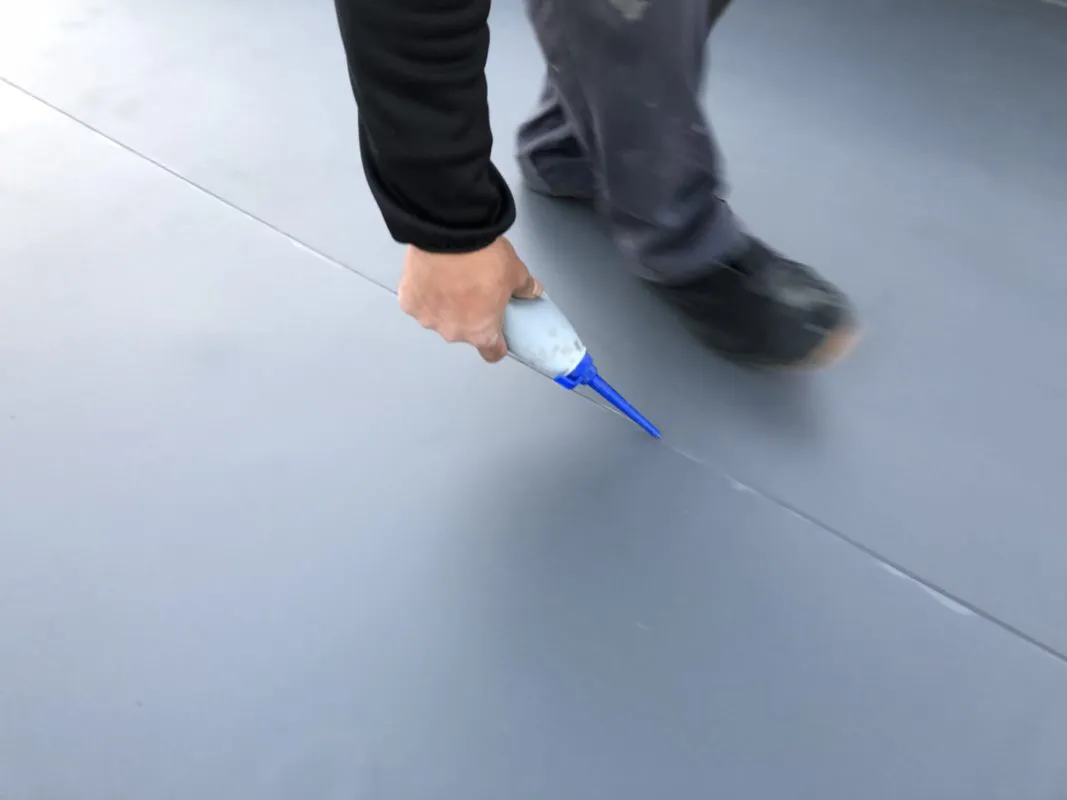 塩ビシートを機械固定する際、塩ビシートと塩ビシートを溶剤でつける作業やビスの選定が重要なポイントとなります。