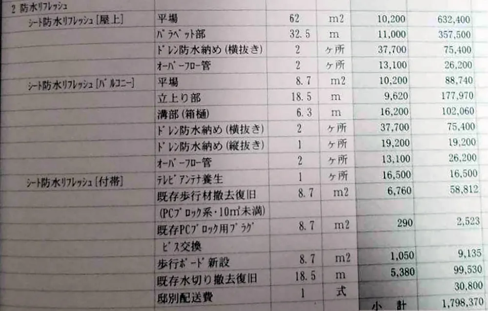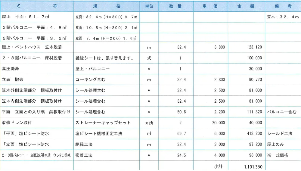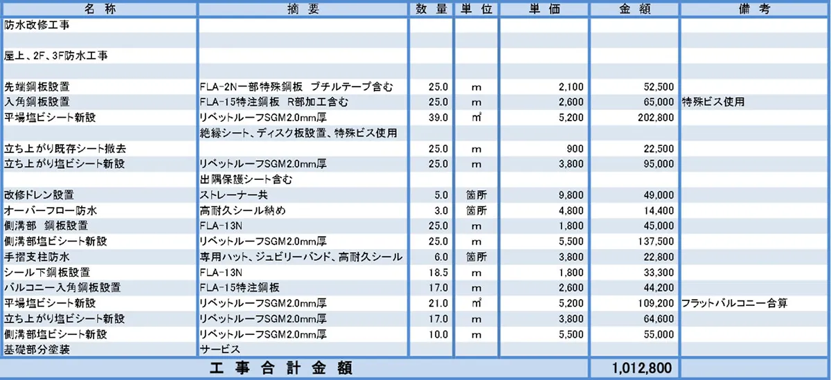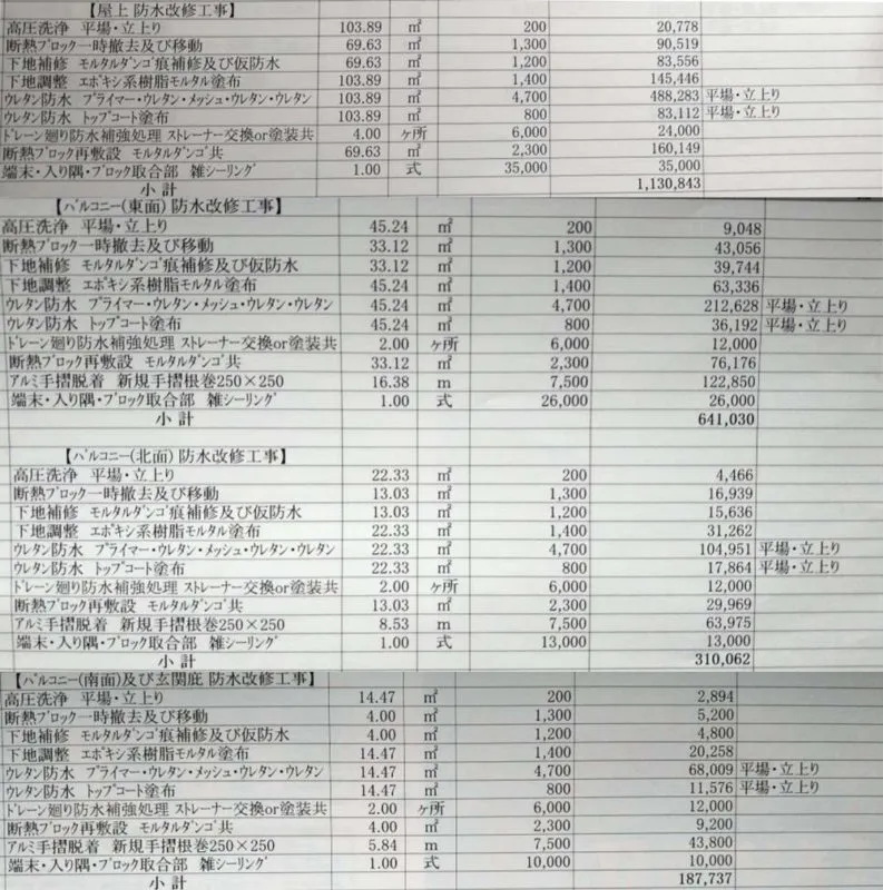 ※ 本来150万円で出来る防水改修工事が、300万円ほどの見積もり金額になることもあります。そのほか、リフォーム工事など現時点では 直す必要がない工事も、見積もりに入れてくる 場合があります。